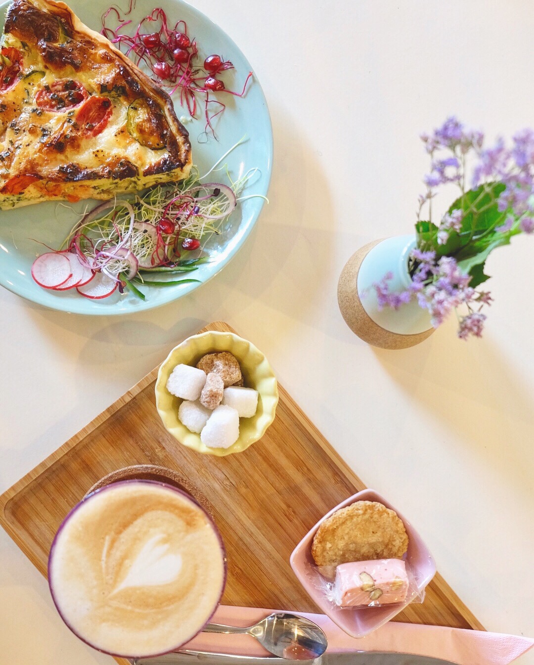 Stepping into Cocotine is a surprise in the best way possible. It’s part of the emerging trend of concept coffee bars popping up around the city, offering an experience, not just a meal. Tucked into quiet Leithstraat just northeast of Ghent, Cocotine really feels like a long awaited local gem. Cosy corners fill the wide open space with plush couches, and purposeful pink and blue pastels touches adding to the colorful charm. Owner Ebru Palit says she started Cocotine as a passion project to merge her love of design, food, and community into one. She loved that the neighborhood feel of the area would add character to the place as opposed to being directly in the city center. The lunch and brunch menu offers an assortment of fun and flavorful coffees, tasty toasts, quiches, and sweet desserts.