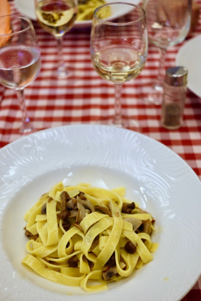 As the afternoon at the winery came to a close, we jumped back in the van and headed into town for a large lunch at a local spot: La Vecchia Frasca. We enjoyed two homemade plates of pasta (ravioli and linguini) and a plate of cheeses, vegetables, and different salumi paired with wine from the vineyard. And if that wasn’t enough, a plate of typical Italian cookies ended the meal on a super sweet note. The owner was lively and didn’t miss a beat when he saw an opportunity to teach a guest the real way of eating Italian Pasta – yes, without a spoon!