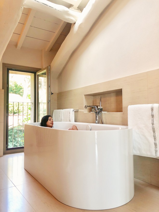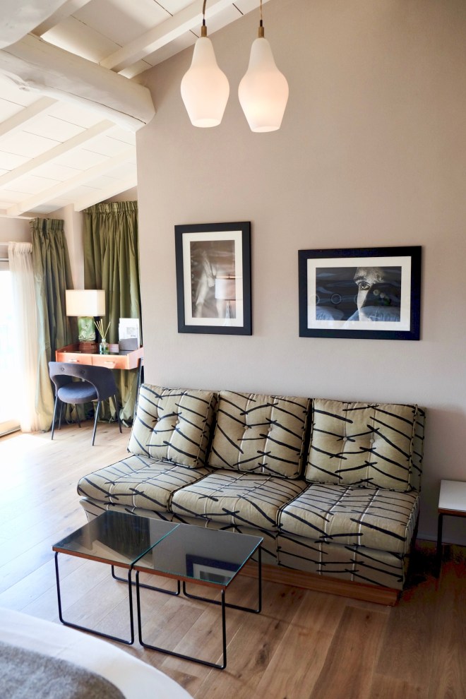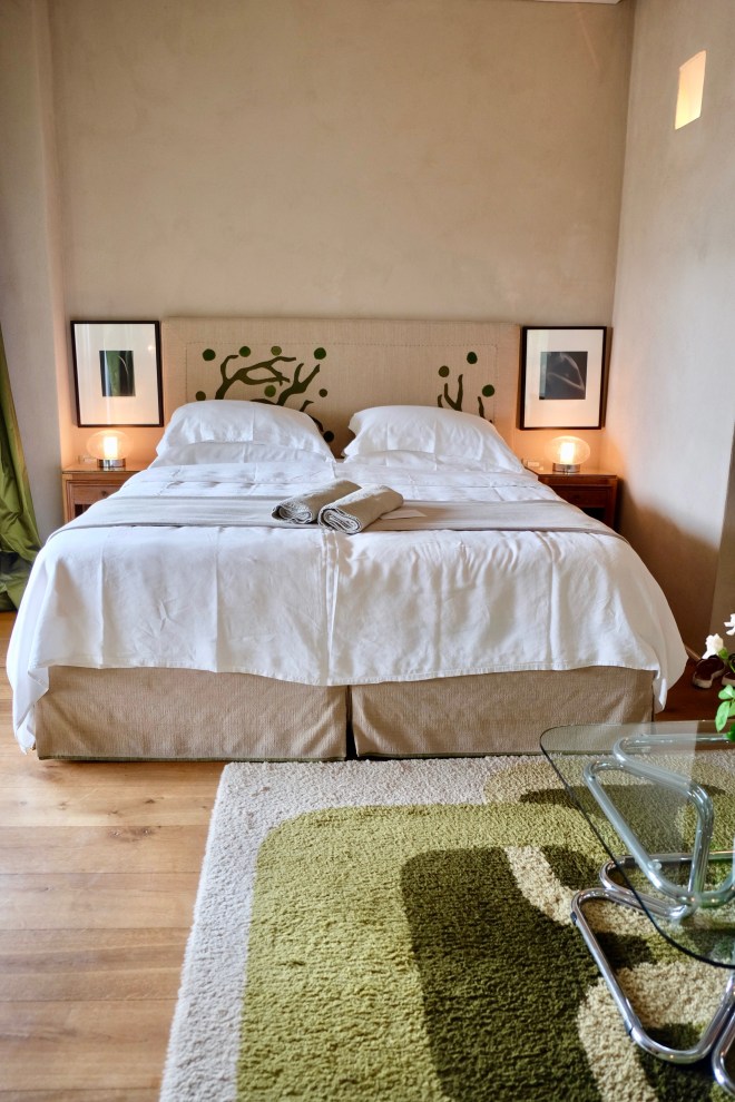 Every room has an outdoor area at Locanda, and I would argue Aurora has the best terrace. In the morning, the sun cut through the valley over the hills and onto the property. Sunrise. With a gorgeous four-post daybed, and French 19th century cast iron fireplace, what an inviting area to relax, share romantic moments by the fireplace, drink some wine, or just admire the view. Inside the room, comforting beige and emerald tones set the mood, a fresh bouquet of flowers is at the center of the room, and black and white photos flanking each side of the bed.
